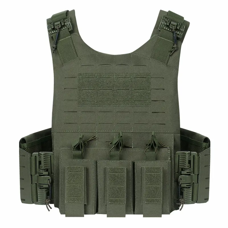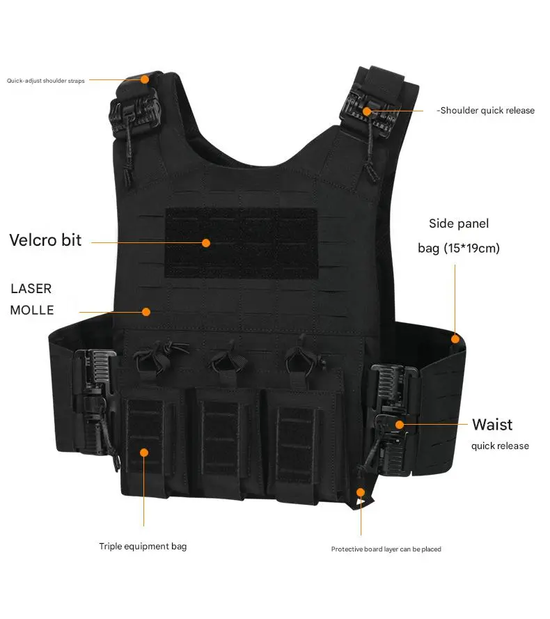 This tactical armor vest integrates MOLLE webbing for gear customization, quick-release shoulder/waist buckles for swift donning/doffing, and a ventilated mesh back for heat management. It’s engineered for airsoft, tactical drills, or field operations, enabling tailored gear organization, secure fit, and instant access to essentials.