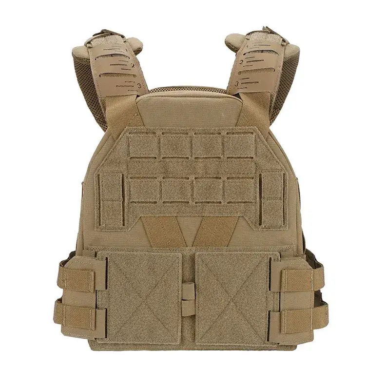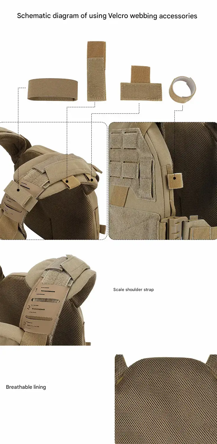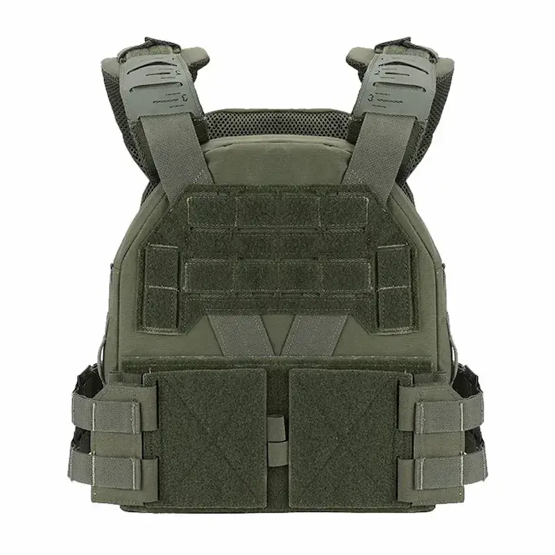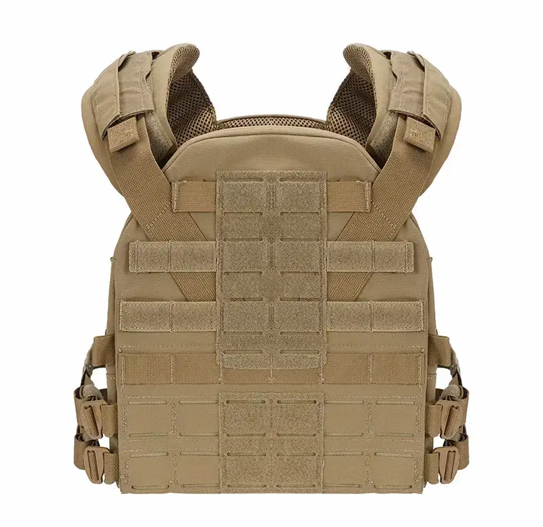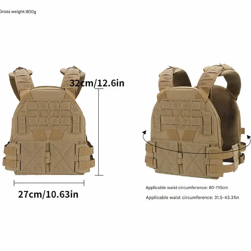 This lightweight plate carrier vest weighs 800g and measures 32cm high by 27cm wide, fitting waists from 80 to 110cm. It has breathable mesh on the shoulders and back for comfort, with MOLLE webbing for attachments. The cummerbund adjusts via velcro or a quick-release buckle.