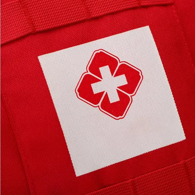 - Punainen nailonrakenne, jossa on valkoinen lääketieteellinen risti laastari edessä näkyvyyttä varten.