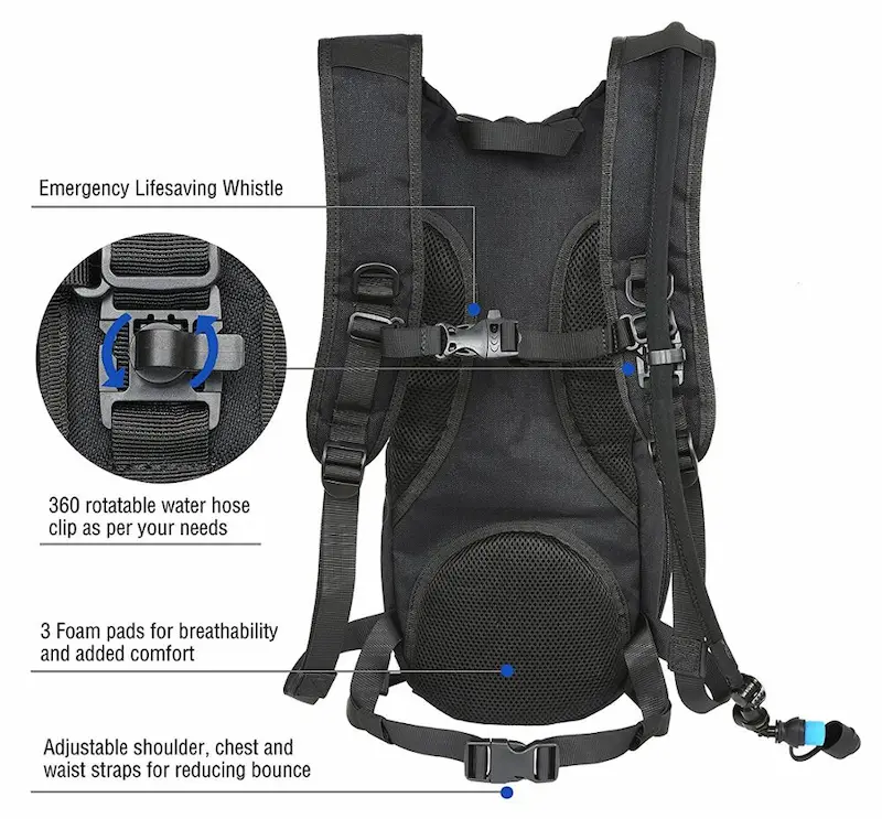 - Emergency Whistle & 360° Rotatable Hose Clip: Safety feature and flexible hydration tube positioning.