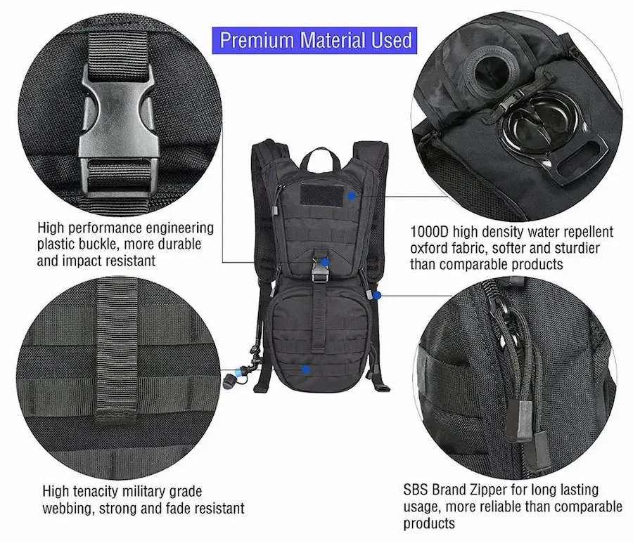 This military-grade hydration pack is built for durability and functionality, featuring a 2.5L water bladder, 1000D water-repellent Oxford fabric, and SBS zippers. It includes MOLLE webbing, multiple compartments, and adjustable straps, making it ideal for hiking, cycling, or tactical operations. Stay hydrated and organized with its breathable design and emergency safety features.