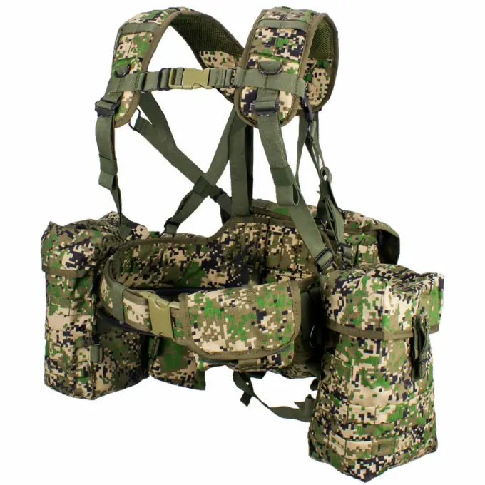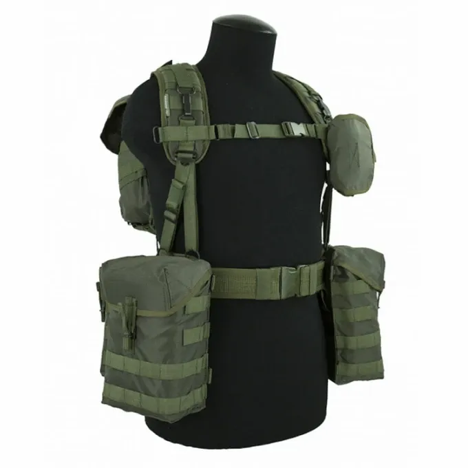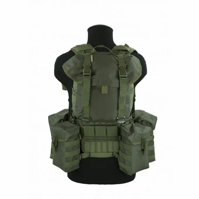 전술 및 아웃도어용으로 제작된 MOLLE 하중 지지 조끼입니다. 어깨 끈이 달린 하네스, 허리 벨트, 측면과 전면에 부착된 파우치가 있습니다. 장비를 더 추가할 수 있는 몰리 웨빙이 포함되어 있습니다. 잡지나 공구와 같은 물품을 휴대할 수 있는 디자인입니다.