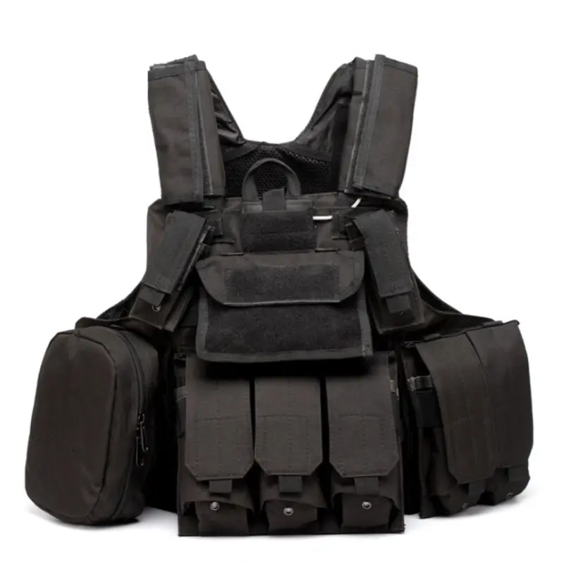 This modular tactical vest has a breathable mesh back panel and adjustable shoulder straps for comfort. It comes with integrated pouches for magazines, utilities, and medical supplies, using MOLLE webbing for customization. Designed for secure gear attachment during field use.