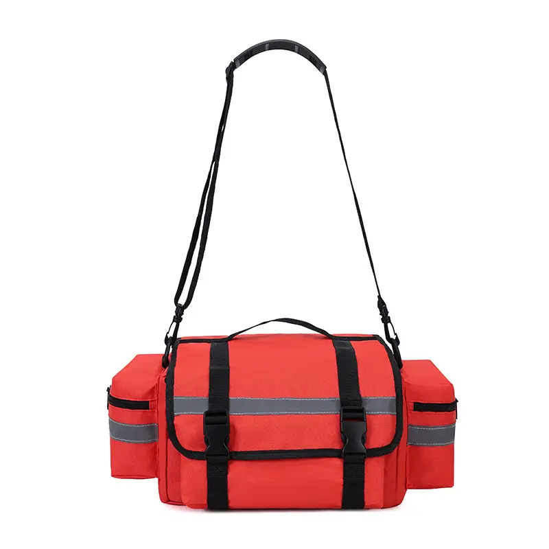 This red medical bag is designed for first responders to carry and organize emergency supplies. It has reflective strips for visibility and multiple pockets for easy access. The bag includes a removable shoulder strap and handle for carrying, with interior dividers to keep items in place.