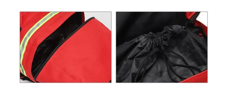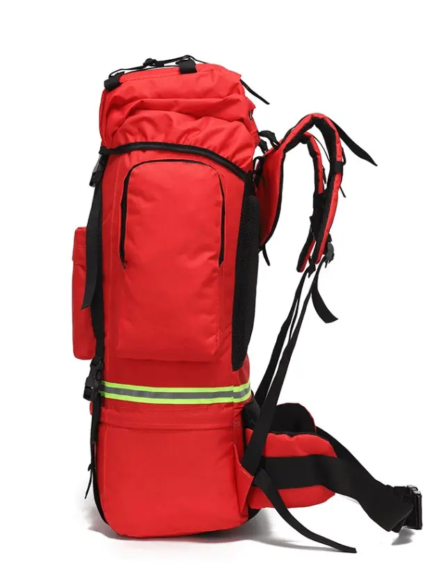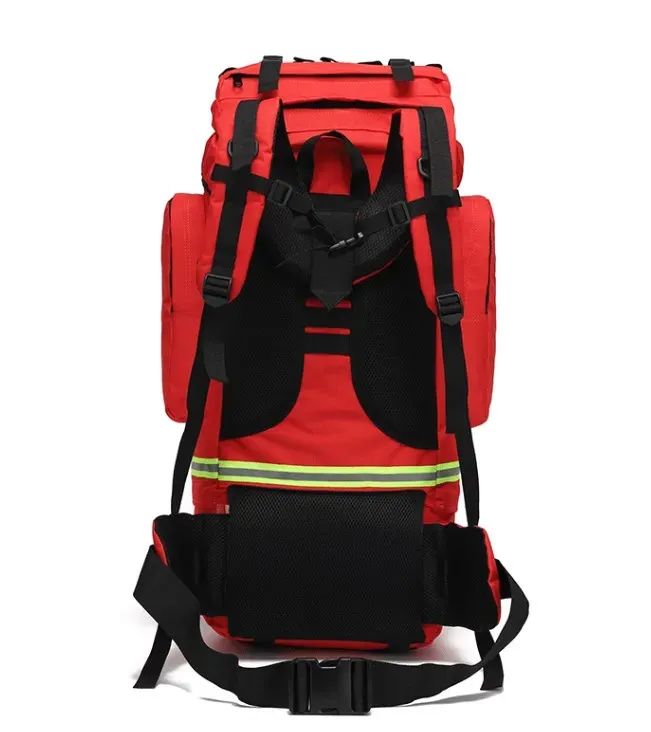This red tactical backpack is built for military, outdoor, and emergency use. It offers a main compartment with a drawstring closure and multiple external pockets for organized storage. Adjustable padded shoulder straps and a waist belt provide comfort during extended carry. Reflective strips on the bottom edge improve visibility in low light.