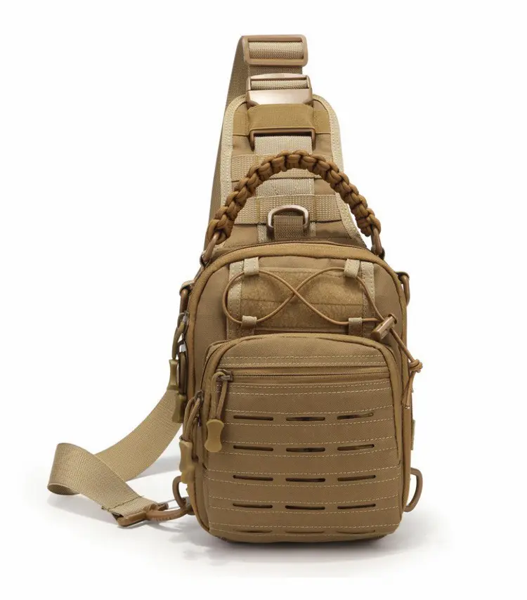 This tactical sling bag features a braided handle and MOLLE webbing for gear customization. It includes multiple zippered compartments, an adjustable shoulder strap, and a breathable mesh back, making it ideal for everyday carry (EDC), hiking, or tactical scenarios.