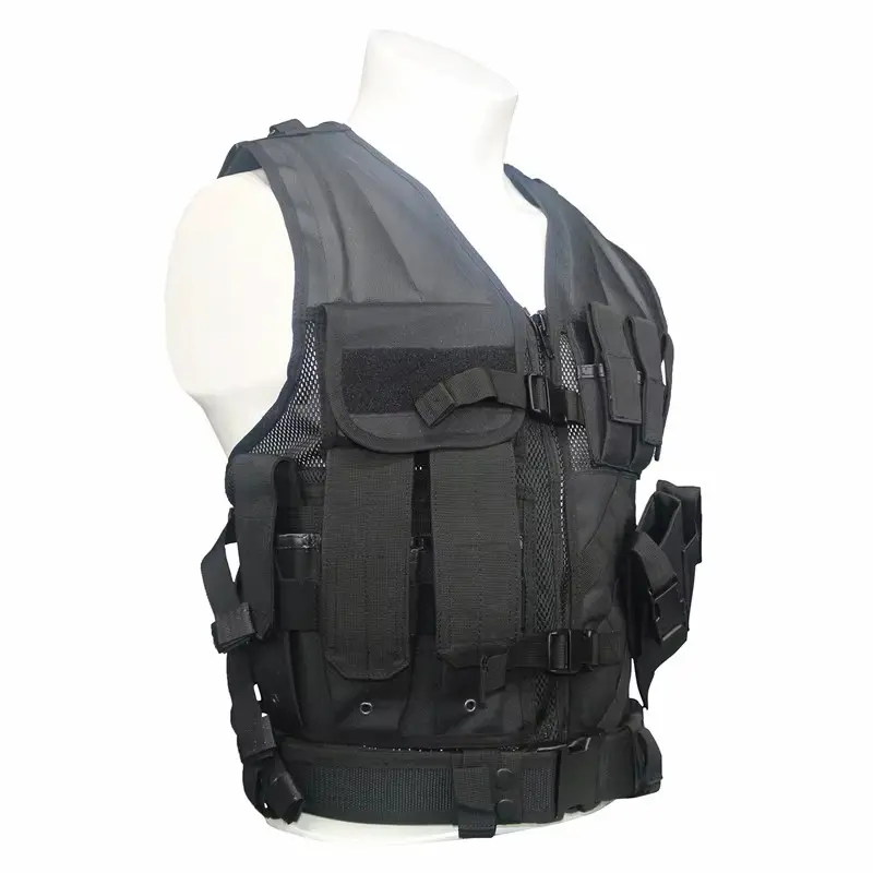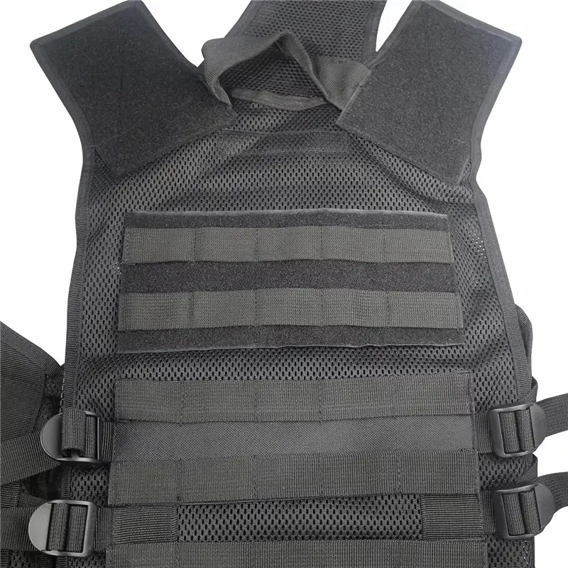 Este colete tático preto possui um fecho de correr frontal para acesso rápido, cintas MOLLE para personalização do equipamento e um cinto ajustável. Com malha respirável, bolsas integradas e alças laterais ajustáveis, foi concebido para aplicação da lei, airsoft, treino tático ou simulações militares, garantindo uma arrumação organizada, um ajuste seguro e uma fácil recuperação do equipamento.