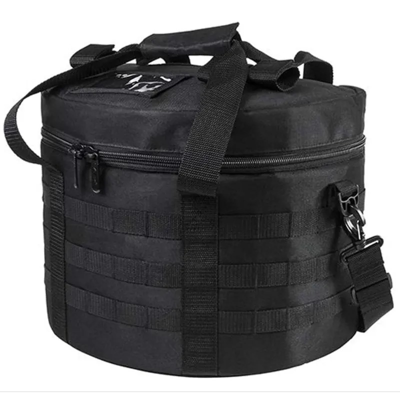 This tactical helmet bag is made for storing and transporting military or tactical helmets. It has a cylindrical shape with internal straps to secure the helmet and external MOLLE webbing for attaching gear. The bag includes a shoulder strap and handle for easy carry.
