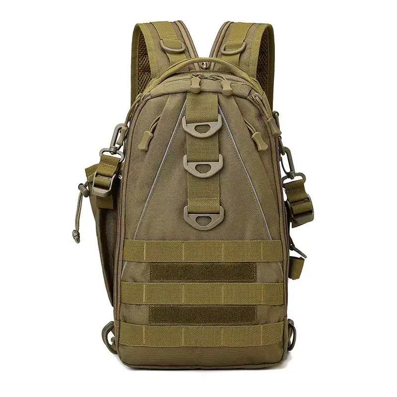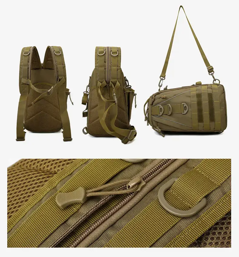 This tactical sling backpack converts from a single-strap sling to a dual-strap backpack with a zipper on the shoulder strap. Made from durable nylon, it features MOLLE webbing and multiple pockets. Includes a detachable shoulder strap for flexible use.