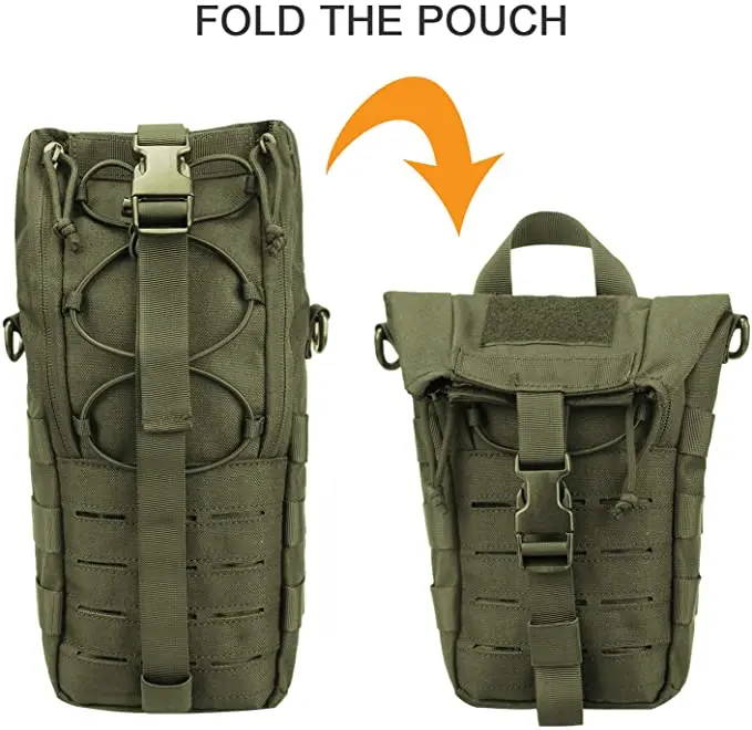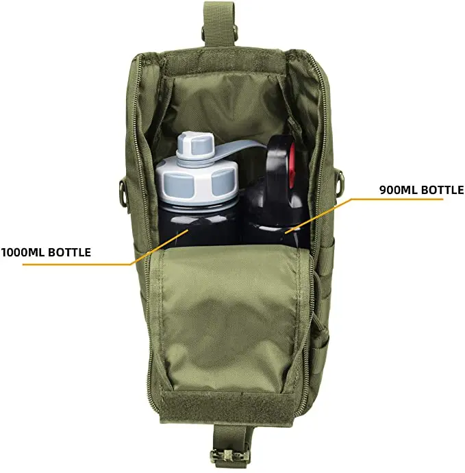 Crafted from 900D polyester, this tactical water bottle pouch features MOLLE webbing, a foldable design, and a main compartment for 32oz (1L) bottles. It includes circular elastic loops for gear securing, a side-release buckle, a Velcro patch area (after folding), and D-rings for versatile attachment. Ideal for hiking, camping, or daily use, it attaches to belts, backpacks, or vests, offering versatile hydration storage.